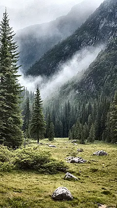 And don’t even get us started on those perfectly spaced evergreen trees, standing tall and proud like they’re waiting for their turn on the cover of “Forest Fashion” magazine. They’re probably thinking, “Another stunning shot for the ‘gram, thanks to our leafy perfection!” Down in the valley, the grassy field with its scattered, ancient-looking rocks gives off major chill-out vibes, like a bunch of boulders decided to have a picnic and just forgot to leave. It’s a scene that screams ‘epic profile picture material’ without even trying!
