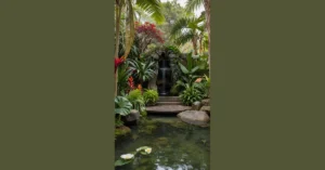 This place looks like it jumped straight out of a “how to relax” commercial, only way better! Seriously, who wouldn’t want this in their backyard? With that perfect golden hour light hitting the trees and the little pond, it feels like nature just decided to put on its best outfit for a photoshoot. And those plants aren’t just surviving; they’re thriving with an energy that makes my own houseplant look like it’s given up on life. It’s the kind of dream garden where you could actually hear yourself think, or more likely, forget about all your homework and just listen to the gentle splash of the water.