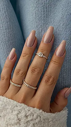 But wait, there’s more than just awesome modern nails! Check out those rings, sparkling like tiny little trophies for your fingers. They’re perfectly matched with the nails, adding just enough bling without going overboard. And that comfy sweater cuff? It just completes the whole look, making everything feel super cozy yet totally put-together. It’s the kind of hand selfie that says, ‘Yeah, I’m stylish, I’m comfy, and I’m ready for whatever the day throws at me, probably with a perfectly manicured thumbs-up.’