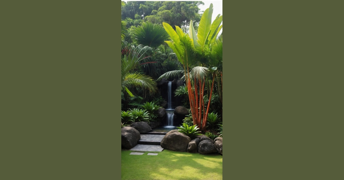 Now, add that sweet little waterfall feature, and you’ve got yourself a plant paradise that probably smells amazing and sounds super relaxing. It’s the kind of place where you expect tiny lizards to be sunbathing on the rocks and maybe a friendly toucan to pop by for a visit. The path looks like it leads somewhere magical, and the grass is so perfectly green it seems fake, but in the best way possible. It just shows how tropical garden plants can totally transform a space, making it feel like a secret oasis hidden away from the rest of the world.