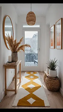 Check out all the cool details that make this hallway pop! That giant pampas grass situation isn’t just for show; it’s basically saying, “Welcome to my chill zone!” The huge round mirror isn’t just for checking if you have toothpaste on your face before school; it also bounces light around, making the whole place feel even bigger and brighter – super smart, right? And those plants aren’t just there to look cute, they’re probably flexing their survival skills after seeing the snow. This whole setup proves that ‘nordic style’ isn’t about having a million things, it’s about picking a few awesome things made from natural stuff, like the wood and woven baskets, that make your space feel super put-together without even trying. Basically, it’s the ultimate ‘I woke up like this’ vibe for your house.