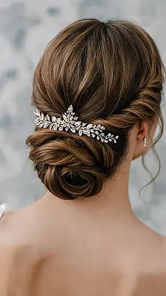 Now, let’s zoom in on that bling! This sparkling hair accessory is basically a crown for your bun, making you feel like a total queen without having to deal with an actual heavy tiara. It’s like your hair decided to throw a party and invited all its sparkly friends to hang out. Imagine trying to take a selfie with hair this fabulous – the light would just *catch* that shine perfectly, making everyone else’s everyday ponytail look a little sad. This isn’t just a wedding hairstyle; it’s a whole vibe that says, “I’m ready for my close-up, whether it’s walking down the aisle or just confidently walking into homeroom on a really, *really* good hair day!”