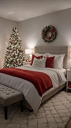 Getting out of bed would be a real challenge in this festive retreat. Just look at that cloud-like white fuzzy blanket! It probably feels like sleeping on a pile of marshmallows, especially with that chunky knit throw adding extra snuggle points. And those deep red and plaid pillows? They’re like little gifts themselves, just begging you to curl up with a hot chocolate and hibernate until spring. Honestly, if my room looked this good, my biggest problem would be convincing myself to do anything else besides snooze and enjoy the holiday magic.