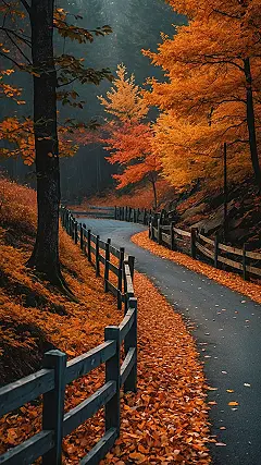 Just look at this path! It’s absolutely drowned in the most amazing orange and red leaves, making you want to ditch everything and just go crunch through them all. The trees are practically showing off their autumn wardrobes, and that cool, misty vibe in the background? Chef’s kiss! You could totally pretend you’re on a secret mission down this winding road, guarded by a rustic fence, instead of, you know, just scrolling through your feed. It’s so gorgeous, it might even convince you that fall *isn’t* just a conspiracy by pumpkin spice latte companies.