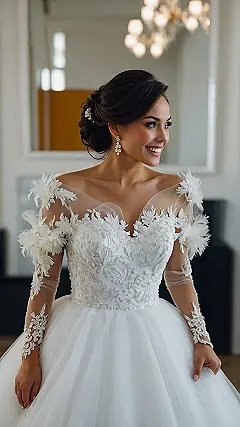This kind of bridal dress is all about making an entrance, and possibly taking up three seats at the dinner table. The fancy long sleeves with the intricate lace detail look super elegant, but you’d definitely need to be careful not to dip them in the gravy! The way the skirt poofs out is pure fashion magic, making anyone feel like royalty, or at least someone who needs an entire elevator just for their outfit. It’s the kind of design that makes you want to twirl, even if it means knocking over the cake.