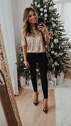 Get ready to steal the spotlight at every holiday party with an outfit that screams “festive fabulous!” Just like the awesome vibe in this picture, rocking a glittery top and sleek black pants is basically a cheat code for looking effortlessly chic. You know that feeling when you try on a hundred different things, and then *boom*, you find the one that makes you feel like the main character? This golden, sparkly top with those cool shoulder cutouts is exactly that moment. Paired with comfy-but-stylish black pants and killer heels (if you dare!), you’ll be ready to snap those mirror selfies and still have room for all the holiday snacks without feeling like a wrapped present yourself.